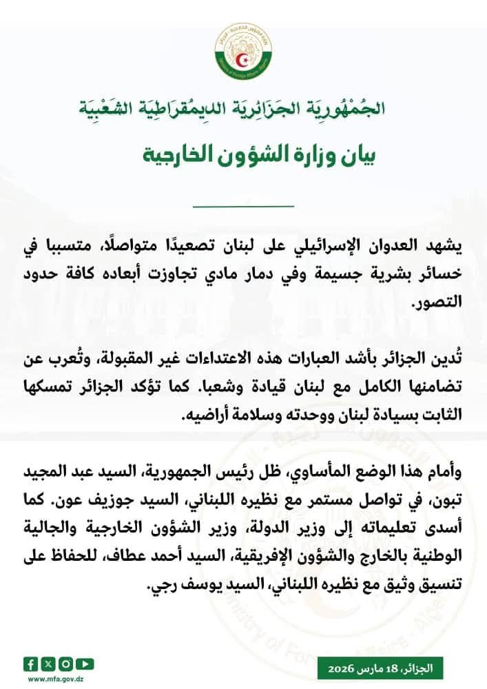 استقبل الأمين العام لوزارة الشؤون الخارجية، السيد لوناس مقرمان، الأربعاء 18 مارس 2026، سعادة سفير الجمهورية اللبنانية بالجزائر، السيد علي المولى، الذي...