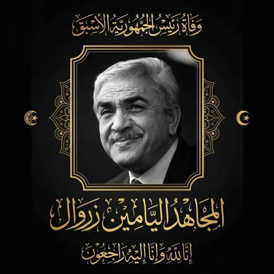 على إثر وفاة رئيس الجمهورية الأسبق المجاهد اليامين زروال، تعلن رئاسة الجمهورية حداداً وطنياً لثلاثة أيام ابتداء من اليوم، على كامل التراب الوطني، وفي ...