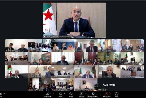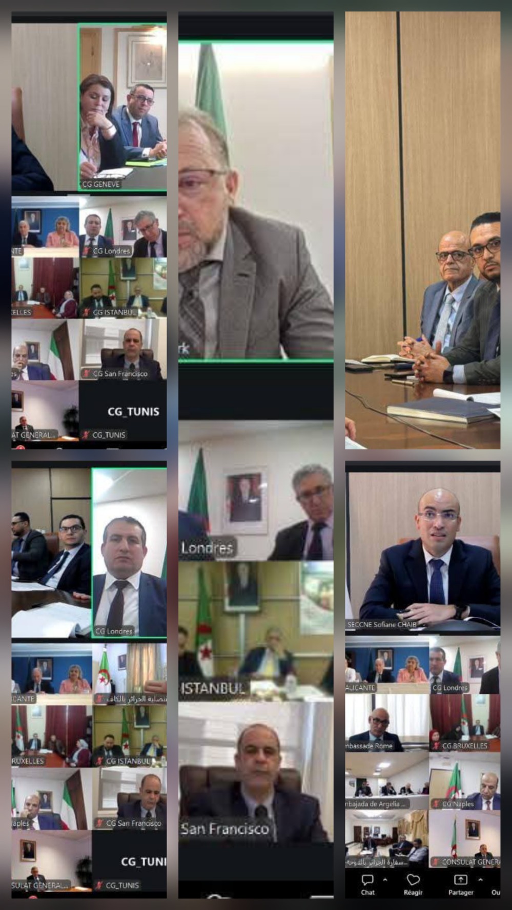 استكمالاً لسلسلة اللقاءات الدورية مع رؤساء المراكز القنصلية بالخارج، عقد كاتب الدولة لدى وزير الشؤون الخارجية، المكلف بالجالية الوطنية بالخارج، السيد سفيان شايب Sofiane Chaib ، اليوم 22 أفريل 2026، اجتماعاً تنسيقياً عبر تقنية التحاضر المرئي عن بُعد، جمع رؤساء مراكزنا الدبلوماسية والقنصلية بأوروبا وأمريكا الشمالية والمنطقة العربية. ويندرج هذا اللقاء في إطار التحضيرات الجارية لموسم الاصطياف المقبل، ومتابعة تنفيذ مخرجات الندوة القنصلية الأخيرة. وقد خُصّص الاجتماع لتقييم مدى جاهزية شبكتنا الدبلوماسية والقنصلية في أوروبا وأمريكا والمنطقة العربية لضمان عودة أفراد الجالية الوطنية في أفضل الظروف، إلى جانب استعراض الجهود المبذولة لعصرنة الخدمات القنصلية وتحسين جودتها. وفي هذا الصدد، أسدى السيد كاتب الدولة توجيهات ترمي إلى تعزيز جودة الأداء القنصلي، وتكثيف التواصل مع الجالية الوطنية بالخارج، بما يعزز ارتباطها بالوطن.