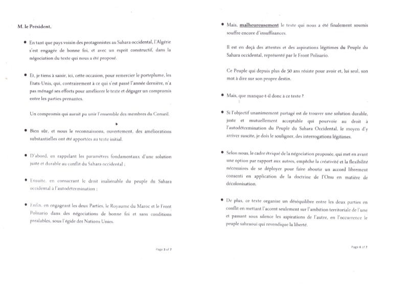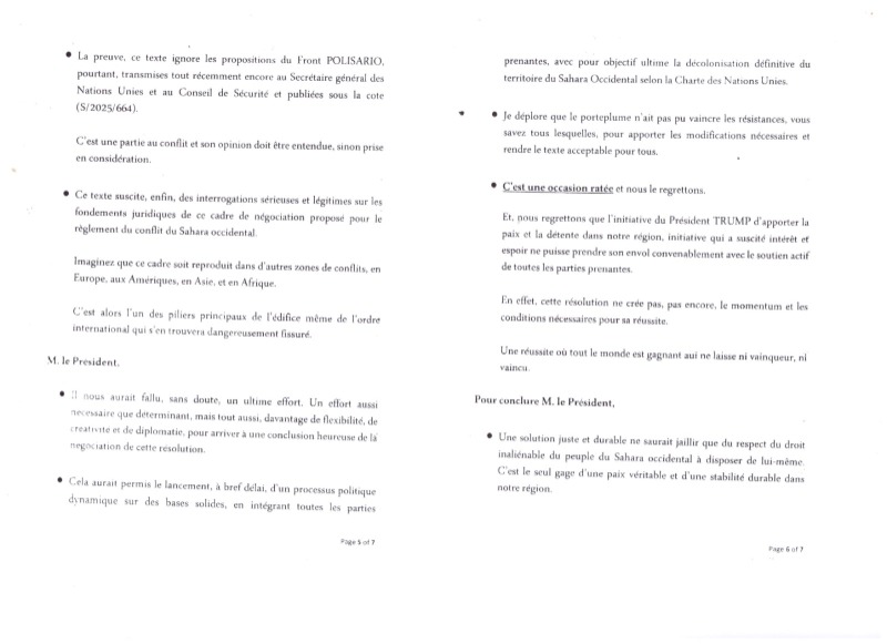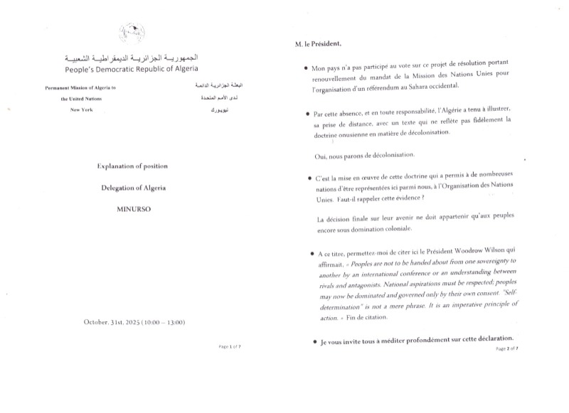 تصريح تفسيري للموقف الجزائري بمجلس الأمن غداة التصويت على لائحة رقم 2797 المتعلقة بتجديد عهدة بعثة الأمم المتحدة للاستفتاء في الصحراء الغربية، المتبناة يوم 31 أكتوبر 2025.