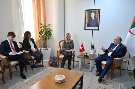 استقبل الأمين العام لوزارة الشؤون الخارجية، السيد لوناس مقرمان، هذا الاثنين 02 مارس 2026، مساعدة كاتب الدولة للشؤون الخارجية مكلّفة بالشرق الأوسط وشمال إفريقيا لدى وزارة الشؤون الخارجية للكونفدرالية السويسرية، سعادة السفيرة مونيكا شموتز كيرغوز، وذلك في إطار زيارة العمل التي قادتها إلى الجزائر. وقد شكل هذا اللقاء سانحة للتطرق لعلاقات التعاون والشراكة التي تجمع الجزائر وسويسرا في عديد المجالات، وذلك في إطار الزيارات والاستحقاقات الثنائية التي تم برمجتها بين البلدين خلال العام الجاري. كما تبادل الجانبان، الرؤى حول أبرز القضايا الإقليمية والدولية الراهنة.
