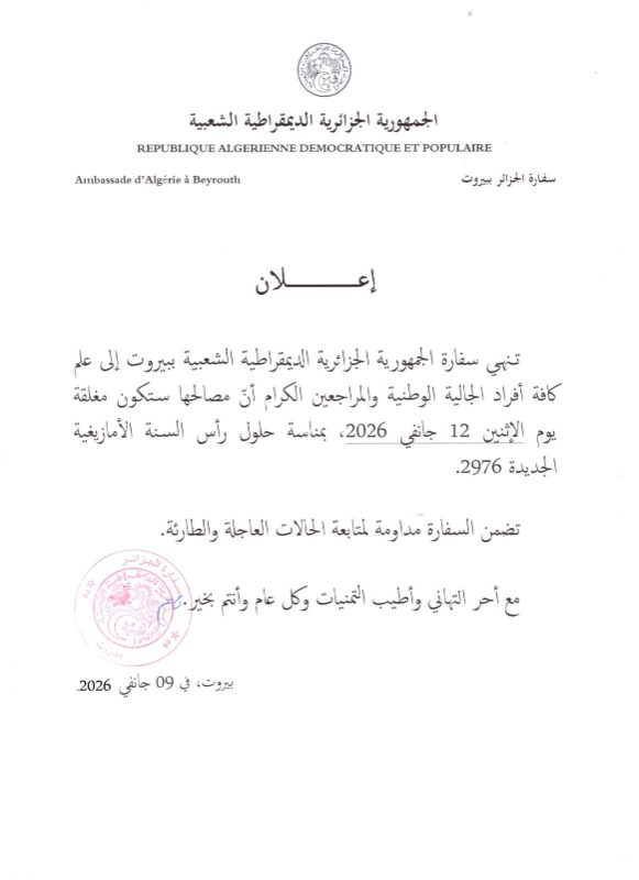 أهلا وسهلا بكم في موقع السفارة الجزائرية في لبنان.